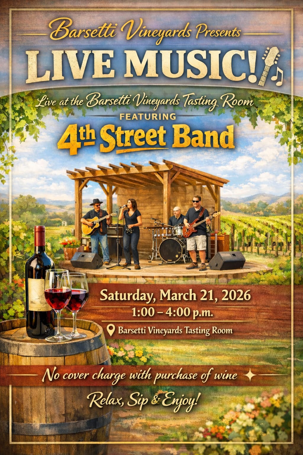 Featuring 4th Street Band π March 21 β° 1:00 β 4:00 PM Spend your afternoon enjoying great wine and live tunes from the 4th Street Band! π·πΈ Kick back, relax, and soak up the vineyard vibes with friends while the band brings the perfect soundtrack to your Saturday. Mark your calendar and join Barsetti Vineyards for an afternoon of music and fun! πΆβ¨Images